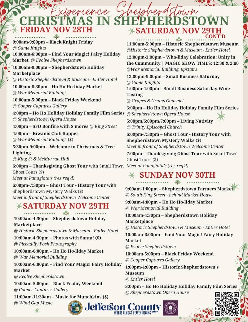 Shepherdstown Welcomes Christmas — Beloved annual tradition that includes a Shepherdstown Fire Department bonfire, Kiwanis chili supper, Mrs. Claus storytime, Santa’s arrival by firetruck, and tree lighting. Downtown Shepherdstown. Friday, Nov 28, 5:30 - 9 pm. Free. Info…