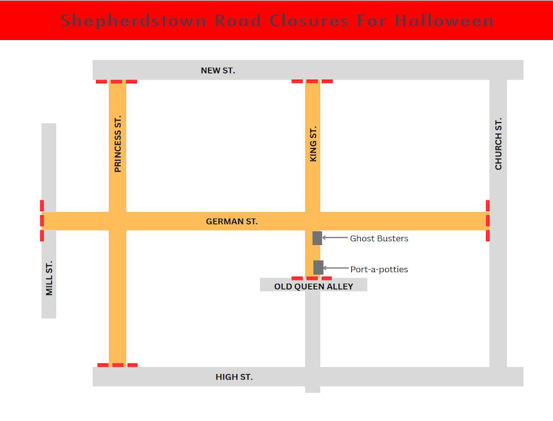 In Shepherdstown, downtown trick-or-treating and street party activities — including the popular Shep’Town Shakers Witches’ Dance — will take place between 6 and 8 pm. According to the Shepherdstown Police Department, several downtown streets will be closed to vehicles between 5:30 and 8:30 pm (see map above). Any vehicles parked inside the controlled area after the barricades are set will not be allowed to leave until after 8:30 pm. Free parking will be available in the Shepherd University lot at the corner of Princess and High Streets and also in the Shepherdstown Middle School parking lot.