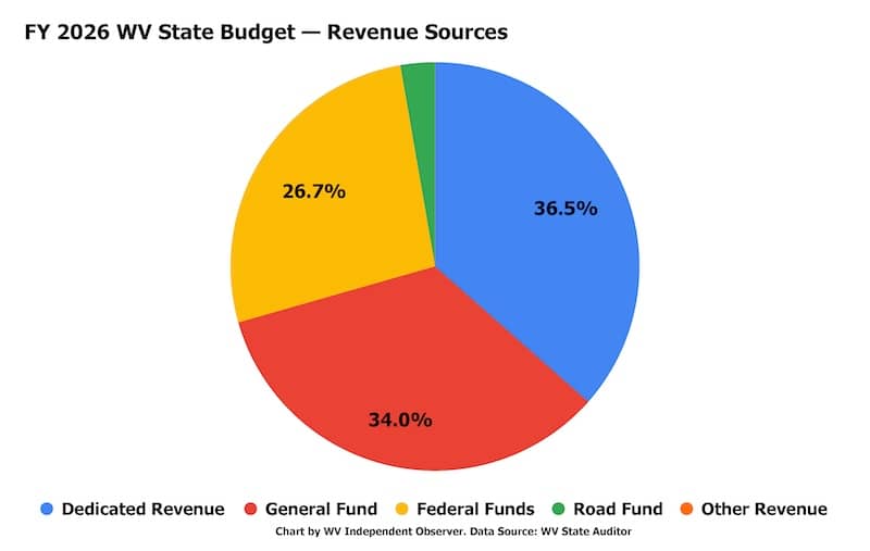 According to information published by the WV State Auditor, federal funds make up approximately 25 percent of the state’s $44 billion operating budget for the current fiscal year (chart above). Morrisey says his plan aligns the state budget with the federal “One Big Beautiful Bill” that was signed into law last year by President Trump. To date, the Governor’s office has not issued any guidance on how the “One Big Beautiful Bill” will directly affect West Virginia’s state budget.