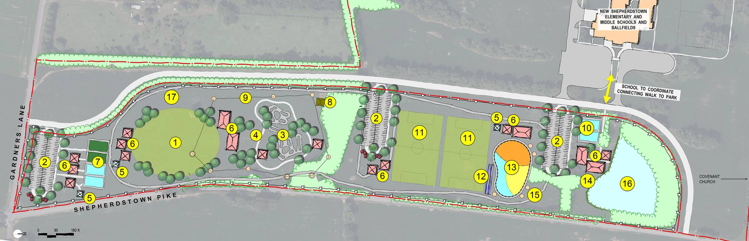 The Jefferson County Parks and Recreation Commission is planning a new county park on the campus of the new Shepherdstown Elementary School. Commissioners unveiled a draft concept plan (image above) at a public meeting on February 18 at Sam Michaels Park.