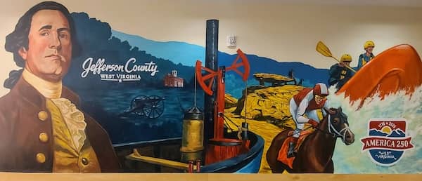 The Jefferson County mural was created by artist Blake Wheeler with direction provided by a committee assembled by County Administrator Edwina Benites-LM. According to the committee records, the prominent image of Charles Washington at the left of the mural marks the beginning of the county’s history. To Washington’s right are images representing the civil war, set against the background of the Blue Ridge mountains. The central element illustrates the steamboat that James Rumsey designed and demonstrated on the Potomac River near Shepherdstown in 1787. The images on the right side of the mural depict scenes from present-day Jefferson County.