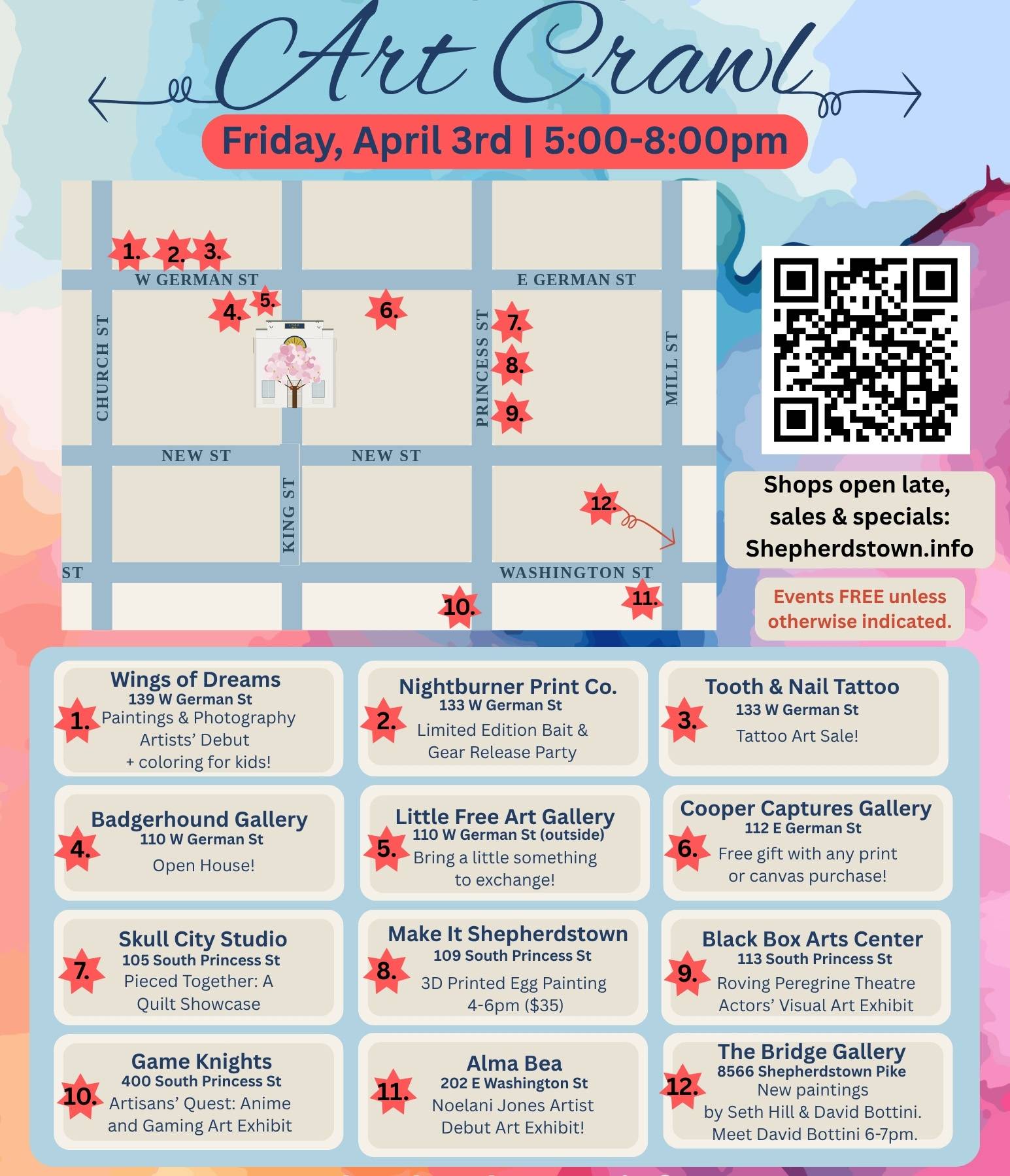 First Friday in Shepherdstown: Art Crawl — Local galleries and shops will be open late with special displays and specials in downtown Shepherdstown - both German and South Princess Streets. Friday, April 3, 5 - 8 pm. Free. Info…