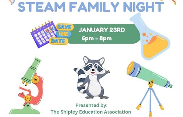 STEAM Night at Shipley — Hands‑on activities in science, technology, engineering, art and math for families. C.W. Shipley Elementary School, 652 Shipley School Rd, Harpers Ferry. Friday, Jan 23, 6 - 9 pm. Free Info…