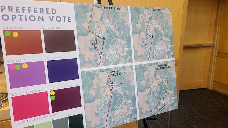 The Route 9 bike path currently extends approximately 10 miles from Grapevine Road in Berkeley County (near the regional jail) to Currie Road in Jefferson County. The plans presented at a public meeting on December 16 at the Jefferson County government building outlined four distinct proposals to continue the path from Currie Road into Ranson and ultimately to the skate park in Charles Town, with multiple variations in the specific route for each of the four proposals.