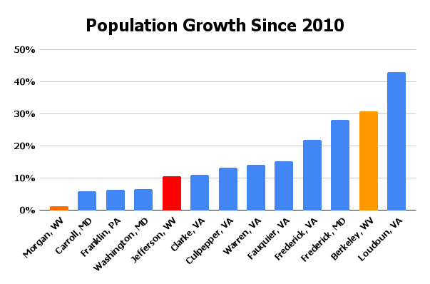 Jefferson has definitely grown at a good clip since 2010, but Berkeley’s 30% growth is 3 times Jefferson’s rate over that 15 year period and Morgan county’s population has remained almost flat over the same period according to US Census data (chart below).