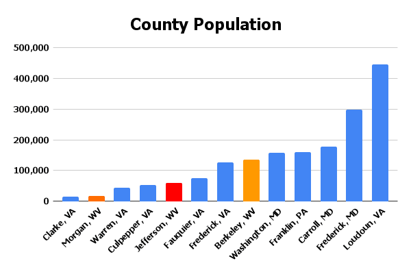 Looking at the total population (chart above), Berkeley is closer in size to Frederick County, VA (Winchester), Washington County MD (Hagerstown), and Franklin County, PA (Chambersburg). The population of Jefferson is more comparable to Culpepper, Fauquier and Warren counties in VA. Morgan is closer in size to Clarke, VA. Lining up all 55 counties in West Virginia, Berkeley has the 2nd largest population (after Kanawha), Jefferson’s population puts it 8th on the list, and Morgan’s population ranks 32nd.